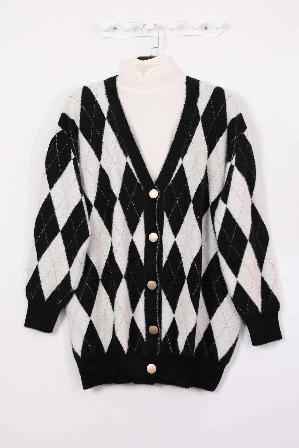 Sakal Simli Baklava Desenli Hırka Siyah