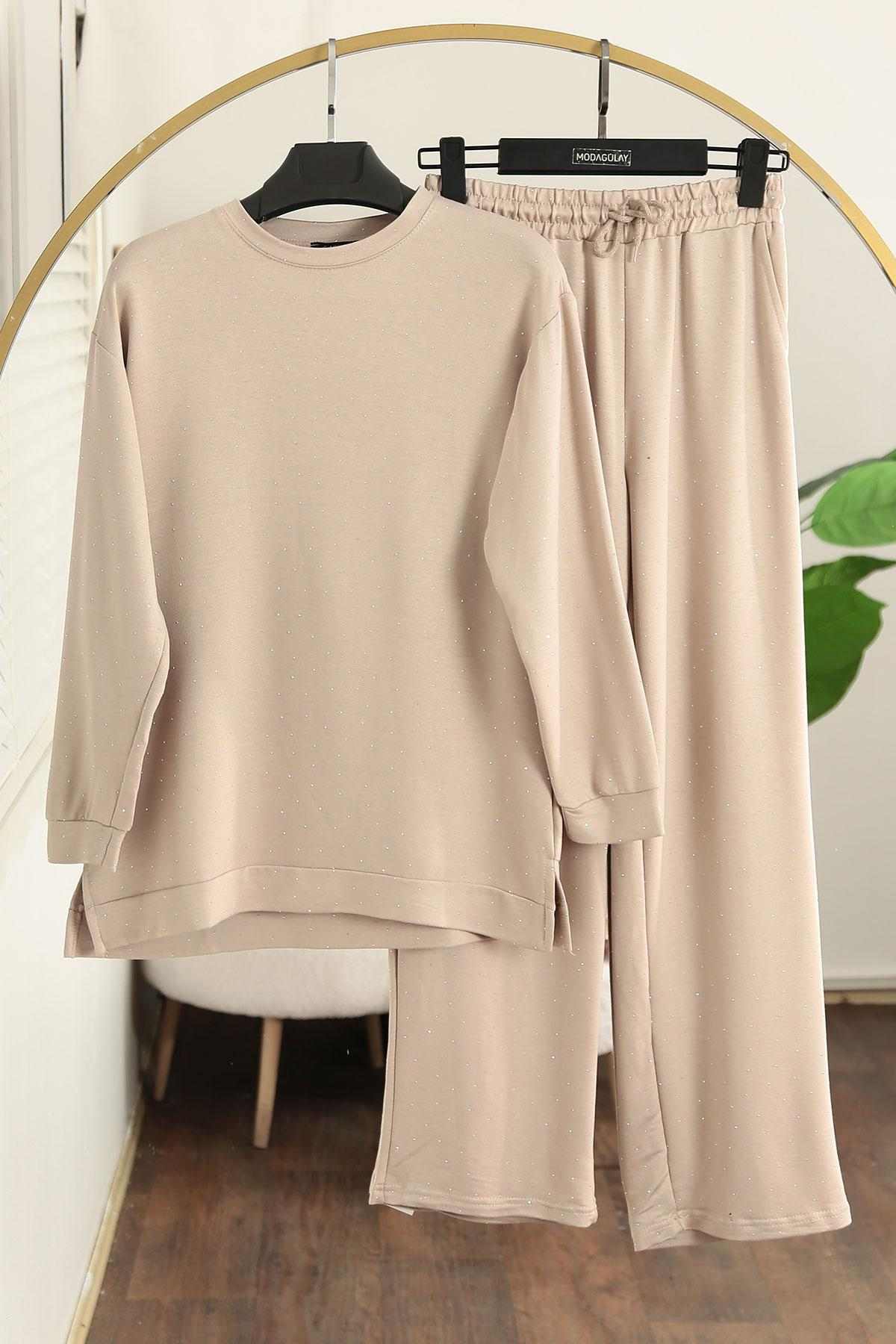 Serpme Taş Detaylı Modal İkiip Pantolonlu Takım Bej