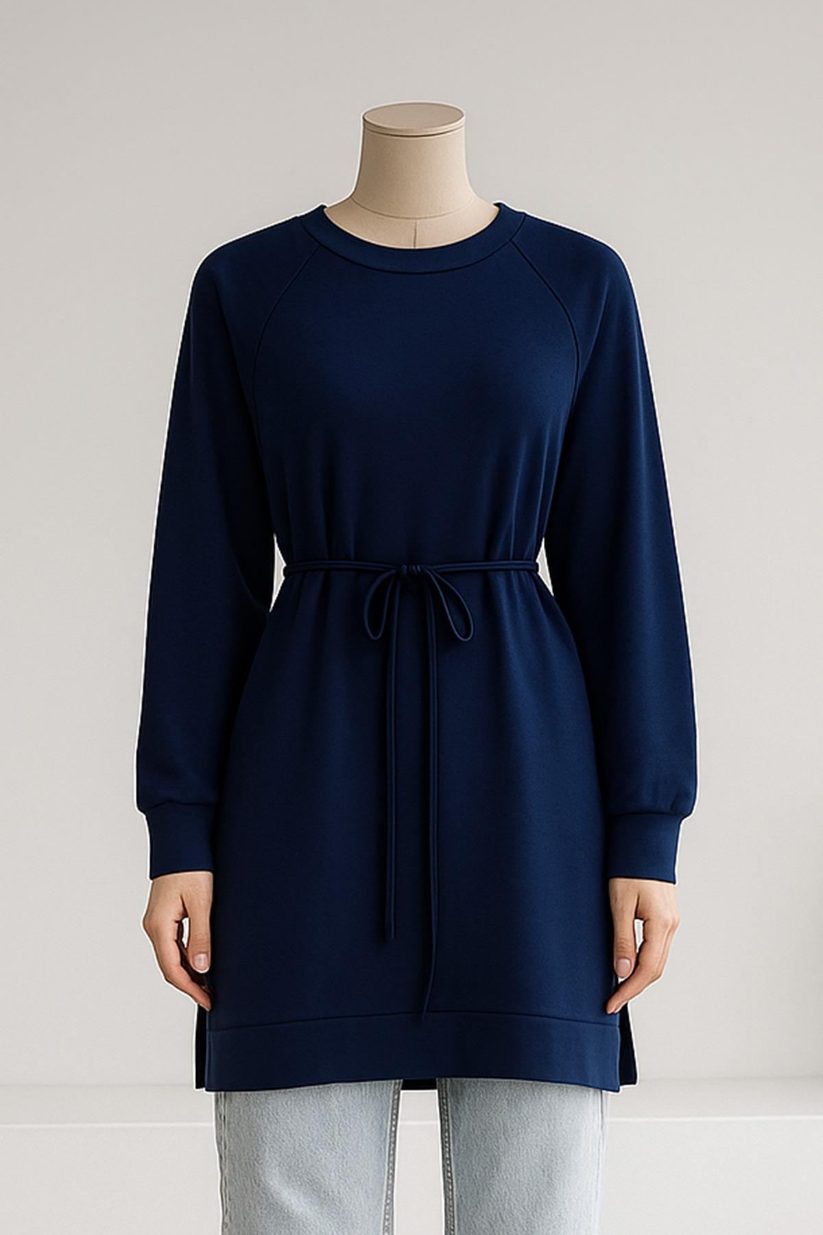 Sıfır Yaka İnce Kuşaklı Uzun Modal İkiip Tunik Lacivert