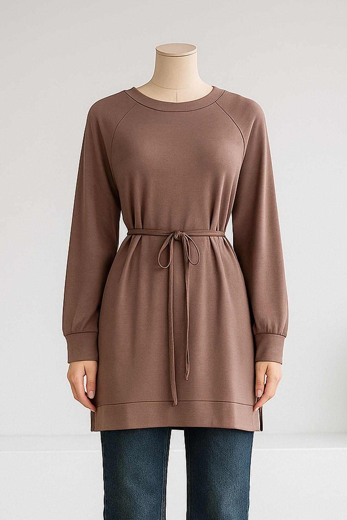 Sıfır Yaka İnce Kuşaklı Uzun Modal İkiip Tunik Sütlü Kahve