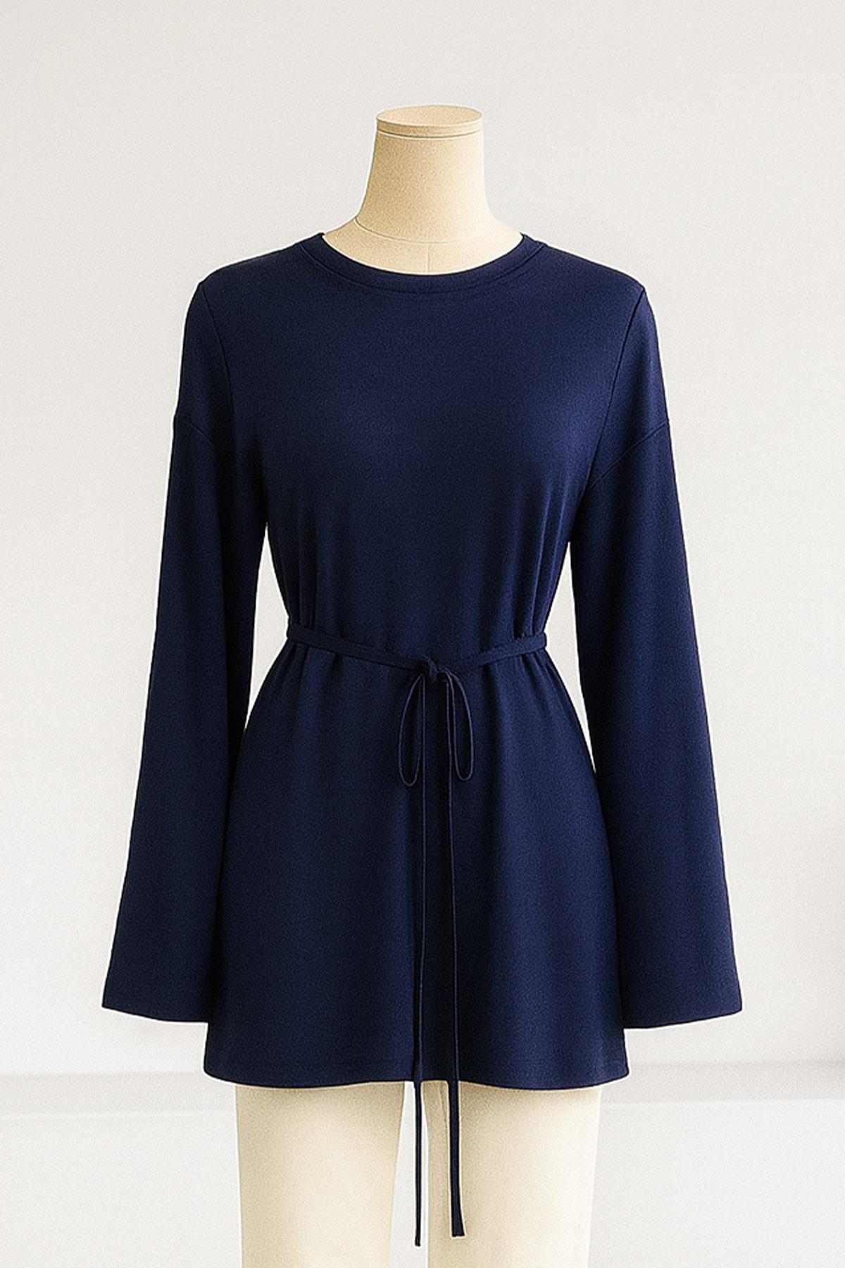 Sıfır Yaka Kuşaklı Bol Kollu Viskon Tunik Lacivert