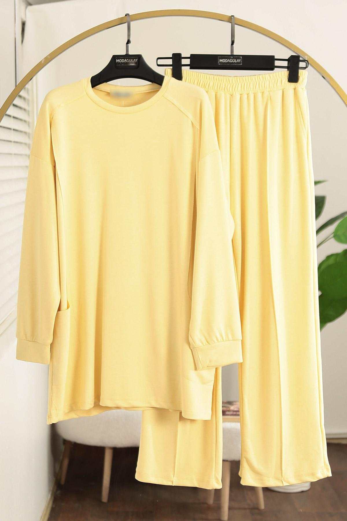 Sıfır Yaka Naturel Dikişli Pantolonlu Aysho Takım Sarı