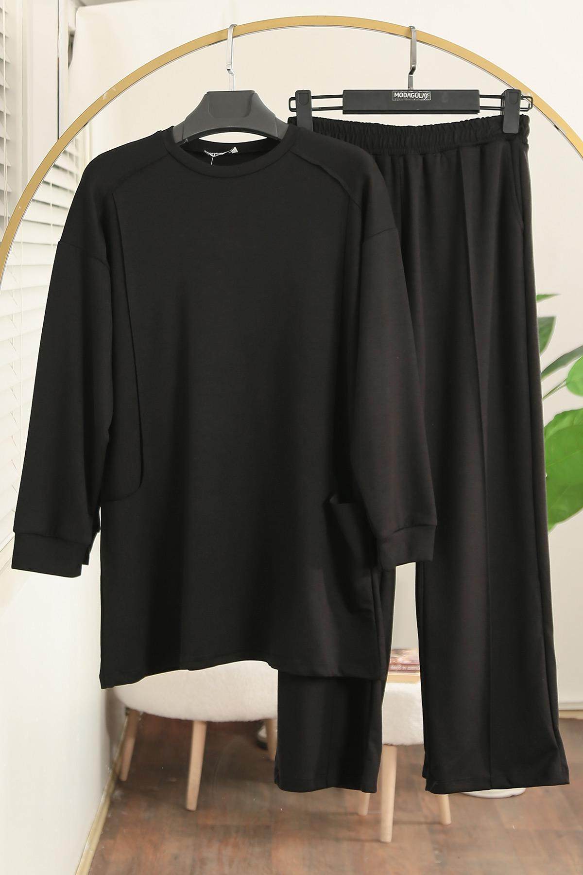 Sıfır Yaka Naturel Dikişli Pantolonlu Aysho Takım Siyah