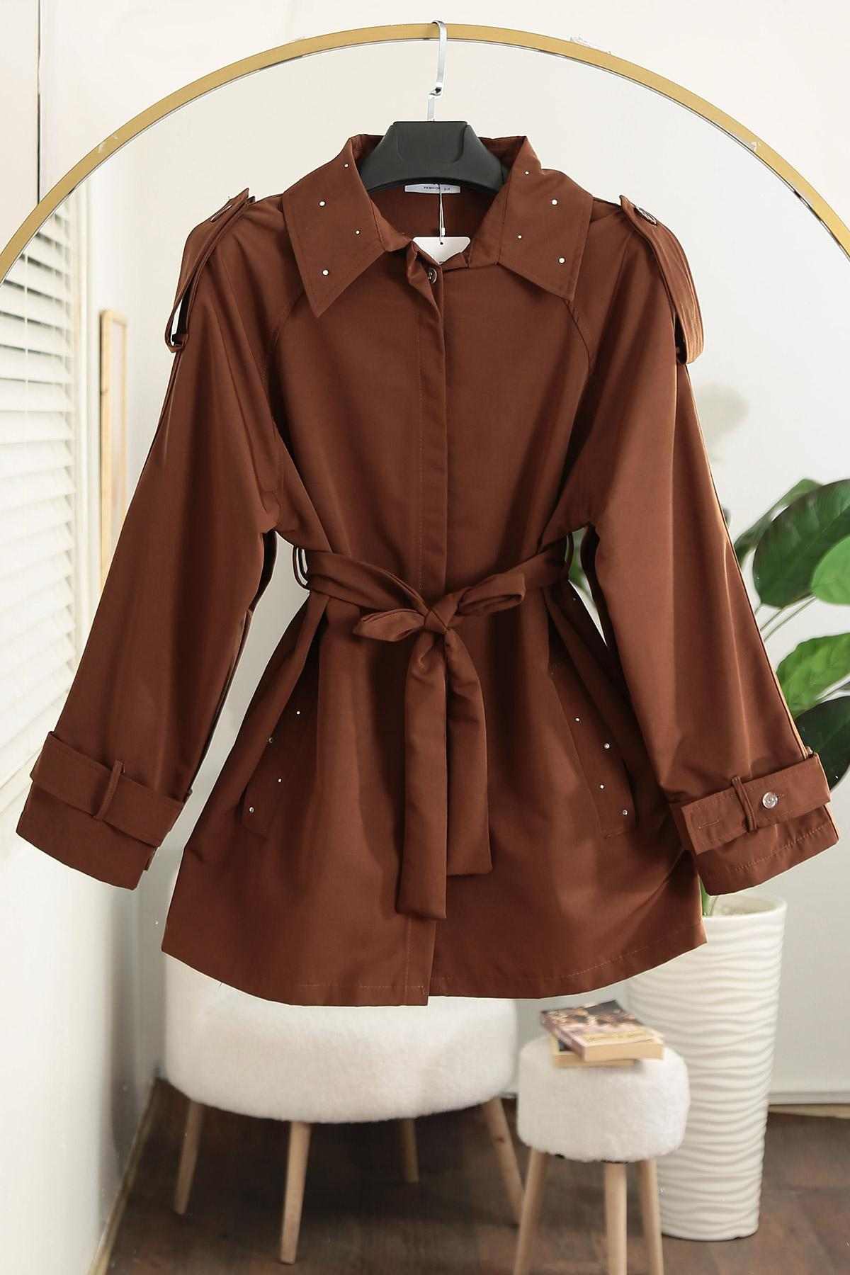 Taş Detaylı Kolu Beli Kuşaklı Trençkot Kahve