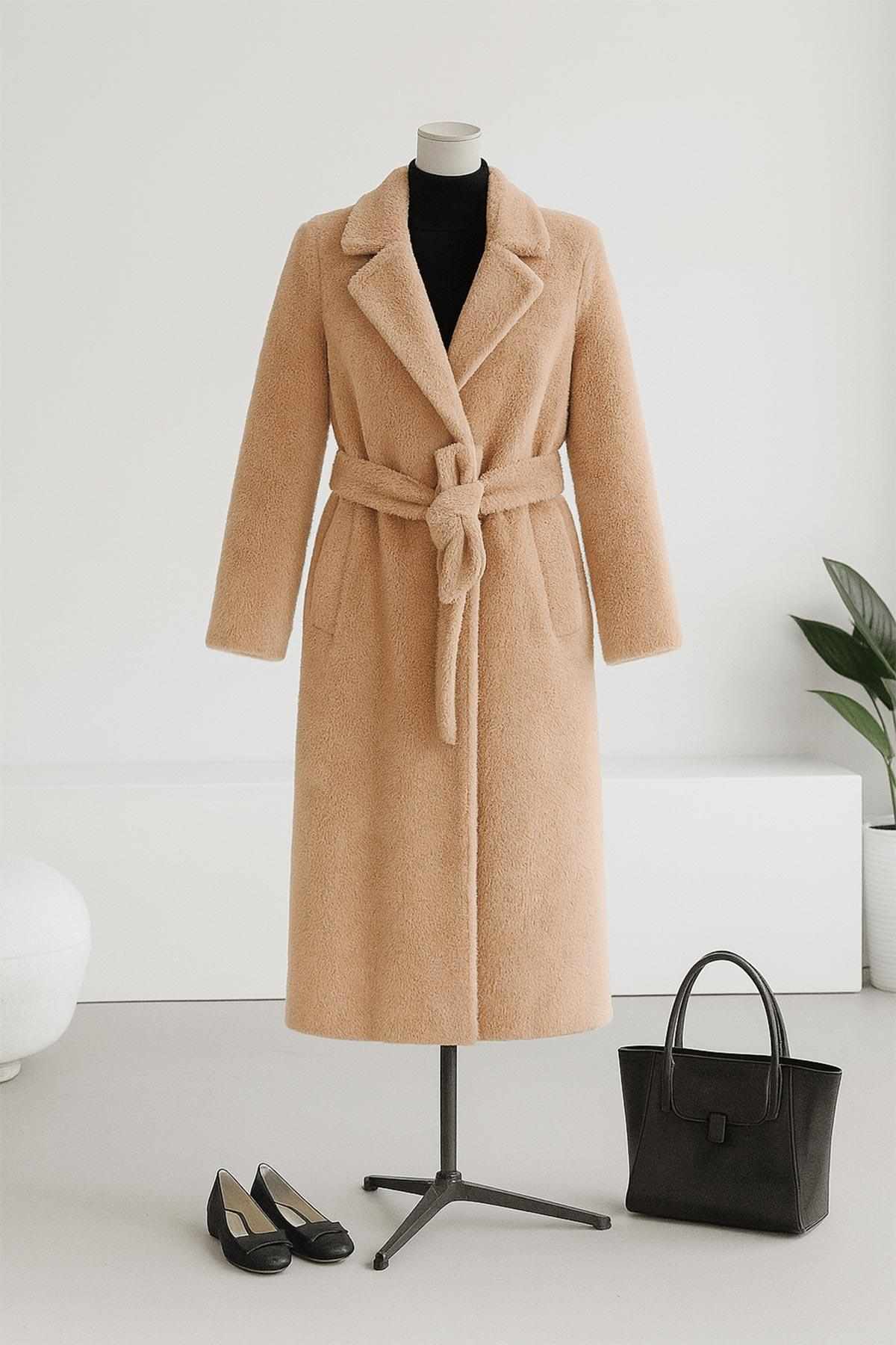 Tek Düğmeli Erkek Yaka Kuşaklı Kürk Kaban Camel