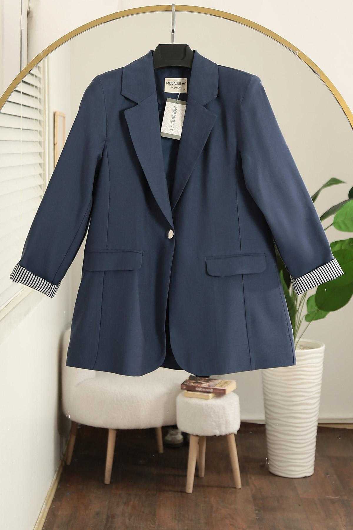 Tek Düğmeli Kolları Katlı Çizgili Modal Ceket İndigo