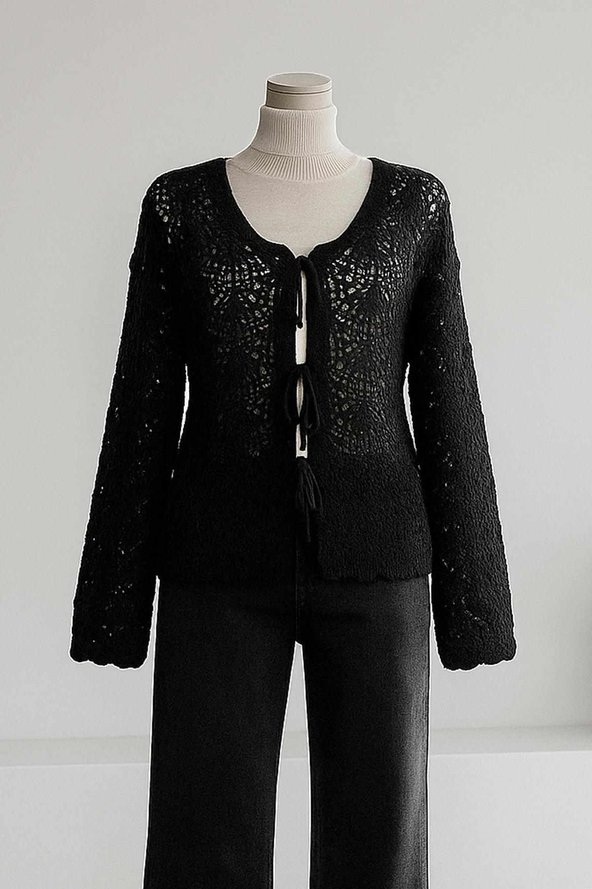 Üç Bağlamalı Ajurlu Triko Hırka Siyah
