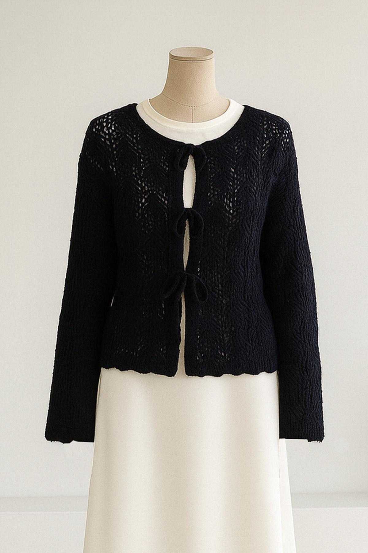 Üç Bağlamalı Desenli Ajurlu Triko Hırka Lacivert