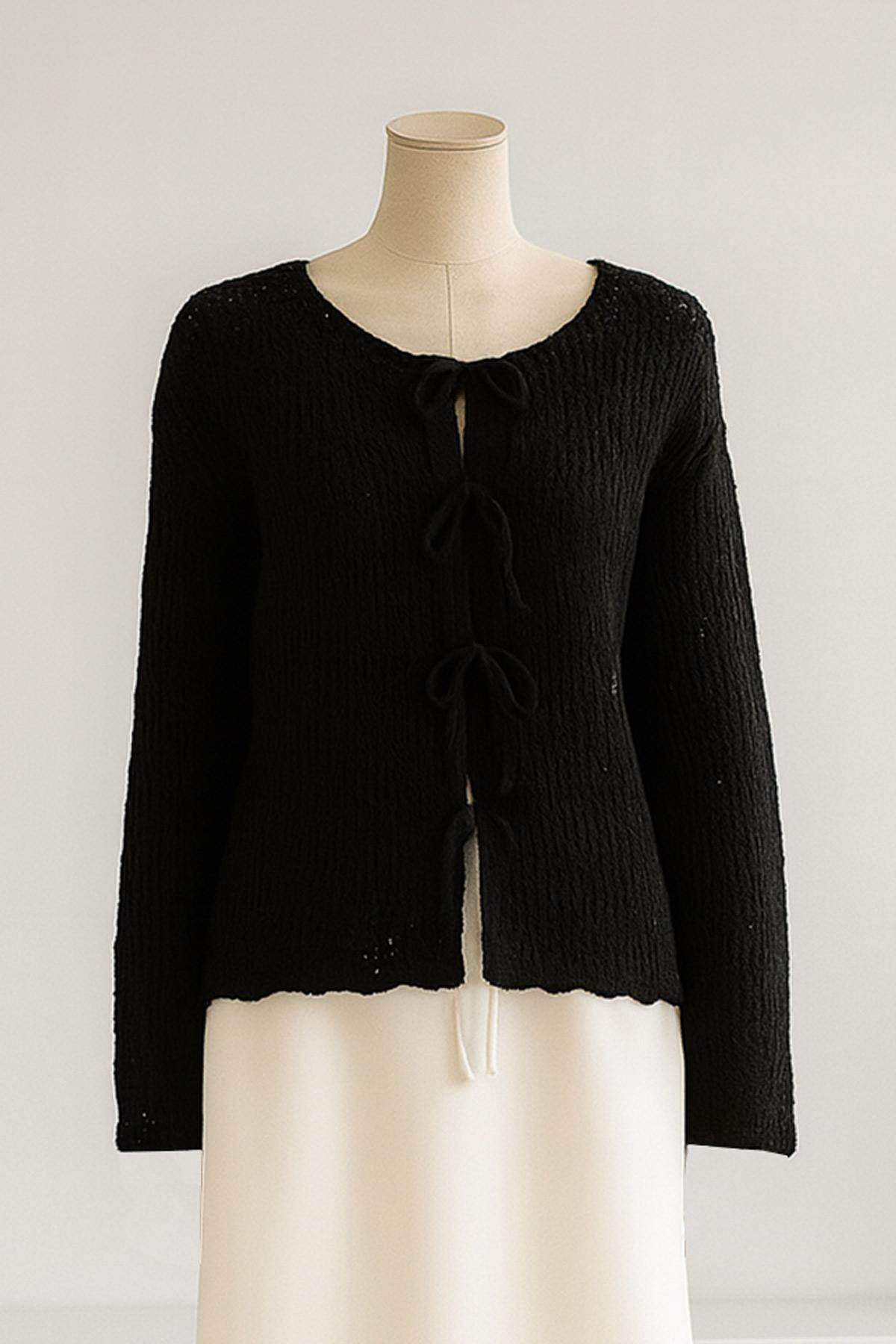 Üç Bağlamalı Desenli Ajurlu Triko Hırka Siyah