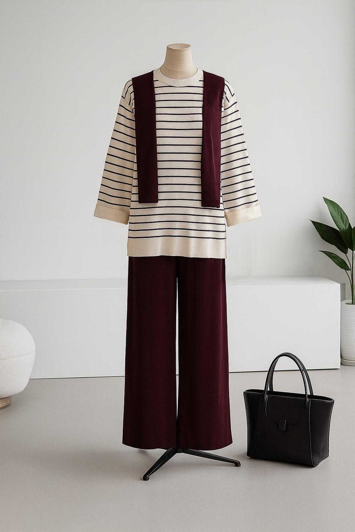 Üstü Çizgili Üçlü Pantolonlu Triko Takım Mürdüm