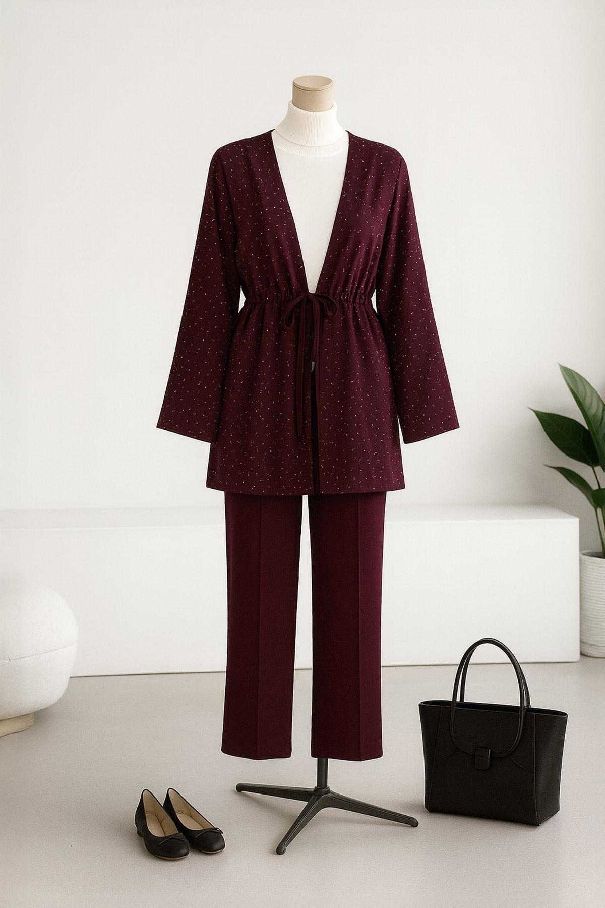 Üstü Taş Detaylı Bağlamalı Pantolonlu Aysho Takım Mürdüm