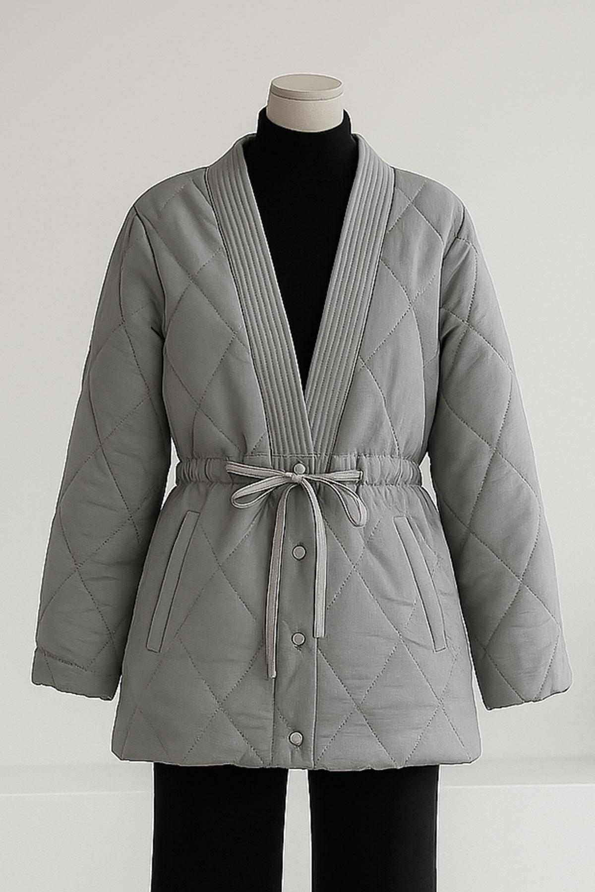 Yakası Gipeli Burbery Bağlamalı Kapitone Mont Gri