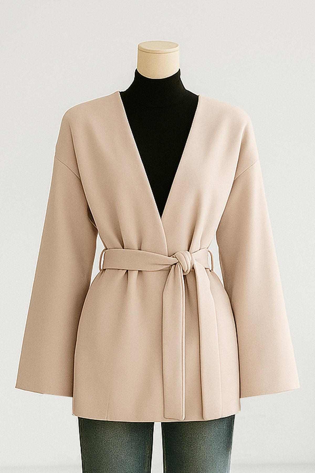 Yakasız Kuşaklı Oversıze Kaşe Ceket Bej