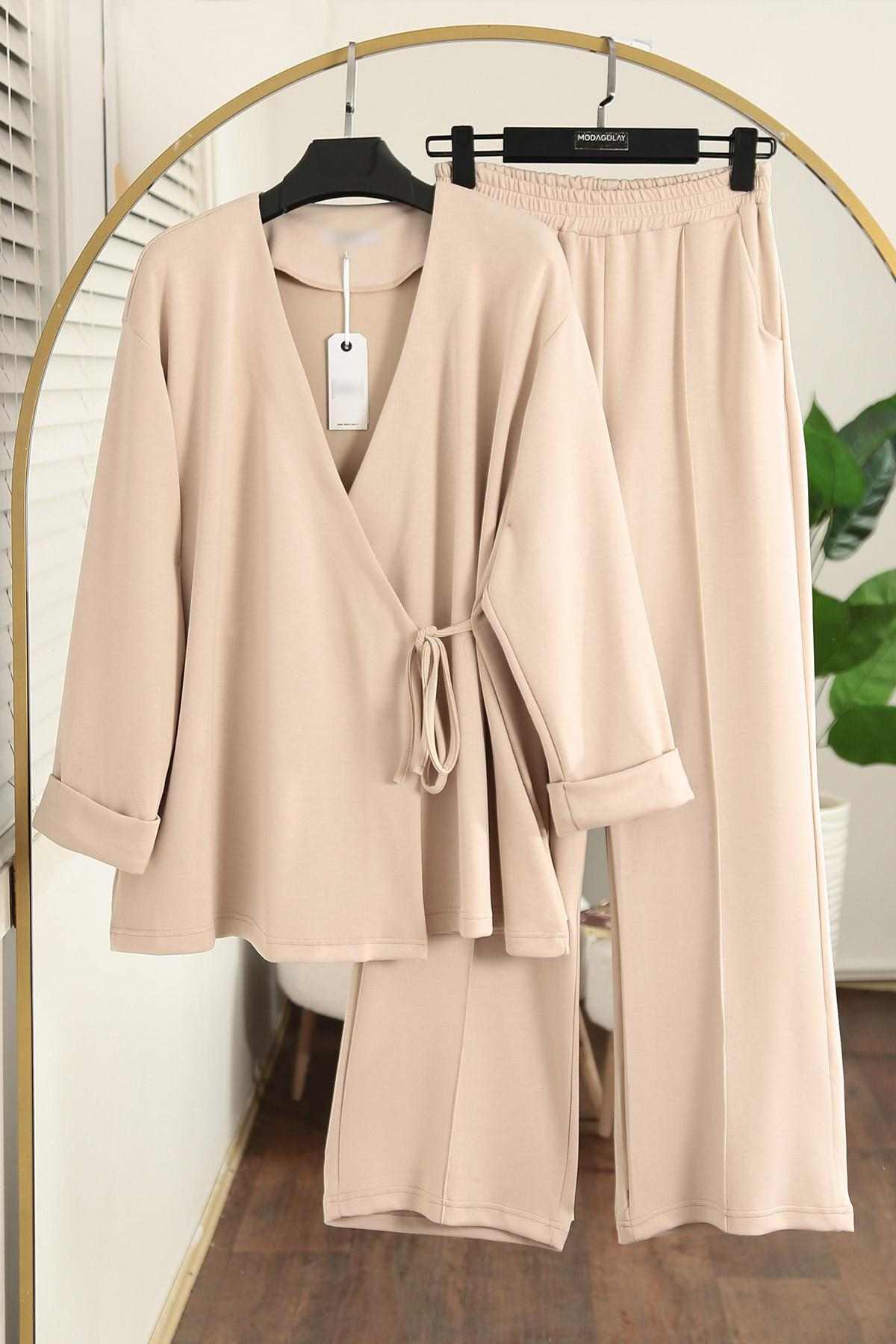 Yandan Bağlamalı Aysho Pantolonlu Takım Bej