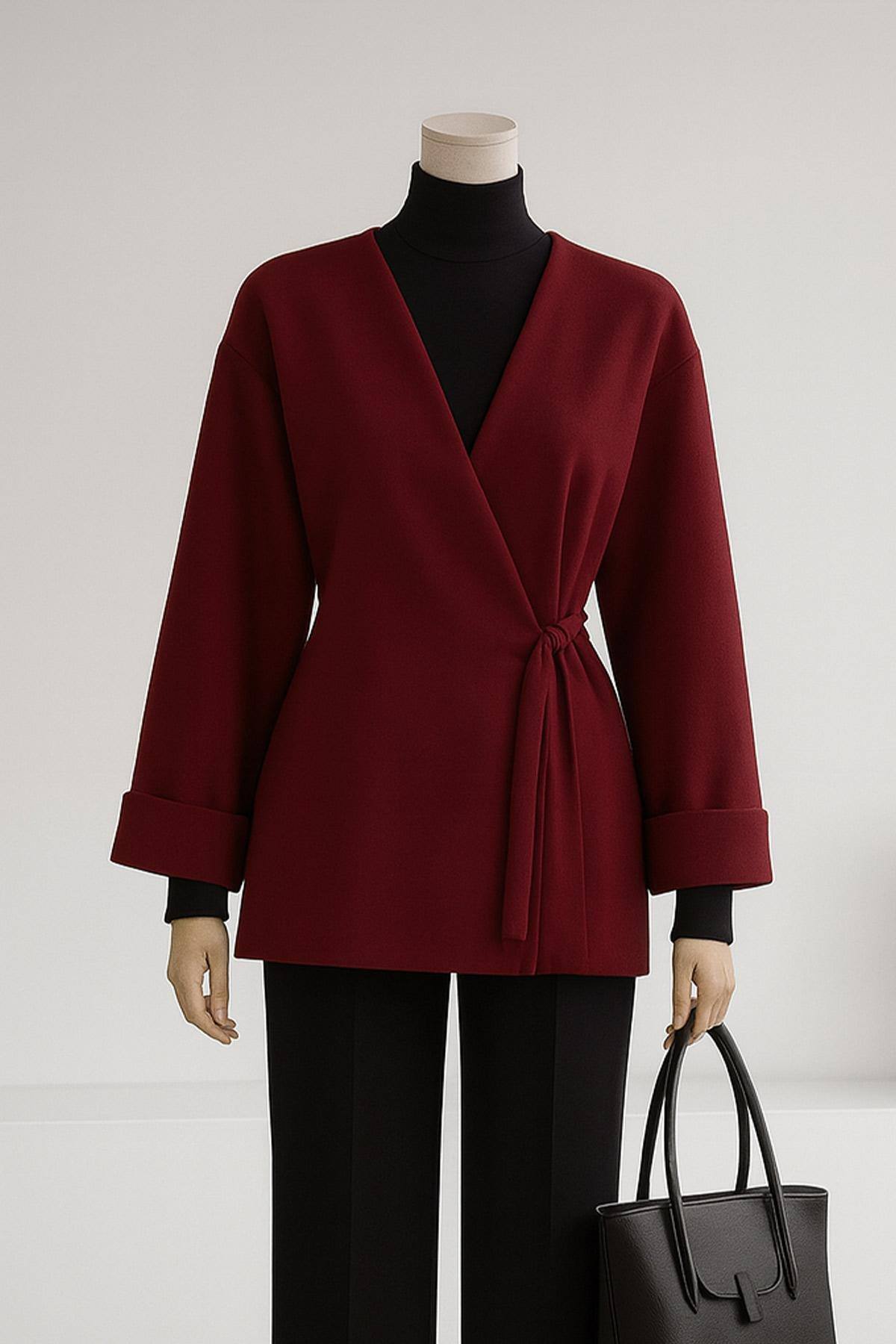 Yandan Bağlamalı Oversıze Duble Kol Kaşe Ceket Bordo